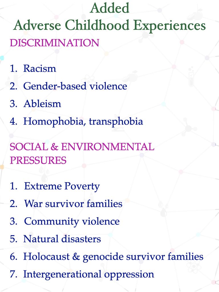 We’re also looking at a person’s environment. Social-environmental pressures are also considered ACEs. These are things like extreme poverty, being a family member of someone who survived a war, community violence, and natural disasters. I think we could probably include this pandemic as a natural disaster. If you happen to be in a family where your parents, grandparents, or great grandparents survived genocide, slavery, or the Holocaust, this is an ACE. Intergenerational oppression as in slavery is also considered an adverse childhood experience.