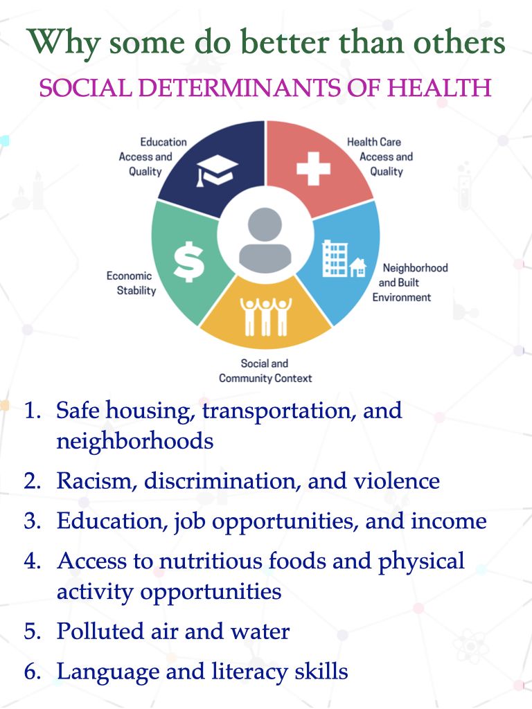 So, again, we ask the question, why is it that some people do better than others? Perhaps you adopted a negative view of people in society from childhood and you experienced chronic fatigue from age twenty-four. It’ll be interesting for you to see where the balance was. Were there any positive things? In public health terms, we refer to what’s known as social determinants of health. We covered this in the last class, so I’m not going to belabor it, but we’re talking about safe housing, safe neighborhoods. Did you experience racism or any discrimination? Was there community violence or gang violence?