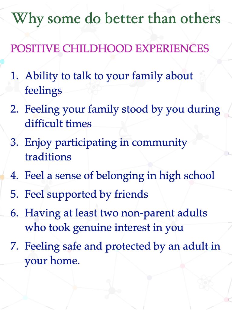 That’s enough of the negative for now. Let’s look at the positive side and the things known as positive childhood experiences. There’s a list of 7 that we typically think through.