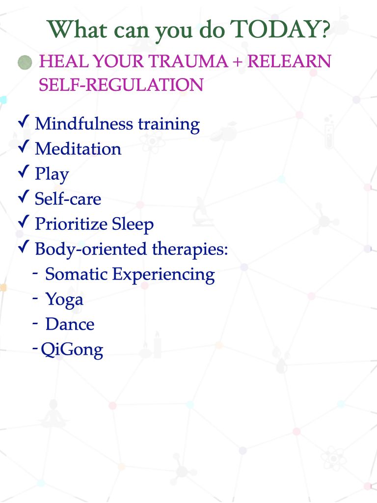 All right, so what else can you do today? My friend, heal your trauma. And relearn self-regulation. The majority of the people that I work with today in the Real Self Love Movement find that they are triggered by the events that they see in the home or the world, and they have to learn how to regulate themselves. In our last class, we talked about how. We learn how to soothe and regulate ourselves based on what happened with our parents, but if our parents were absent or inconsistent or neglectful or even abusive, abusive, then we may not know how to regulate our emotions, how to calm down. We may stay triggered if we experienced developmental trauma or our brain and our nervous systems are on hyperdrive.