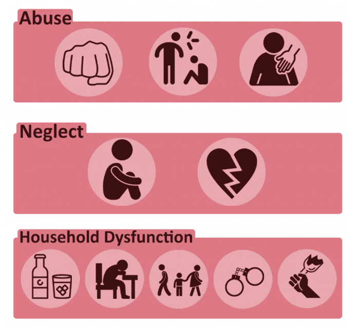 ACEs consist of three categories of experiences that occur before the age of 18. This includes abuse – physical, emotional, or sexual. It also includes neglect which can be physical abandonment or emotional distancing. We’re also talking about household dysfunction. That means if you had anyone in the home who was a drinker, who had a chronic illness, if there was divorce or separation or loss of a parent due to death, if a family member was in prison or you were in foster care. These are all considered family dysfunction.
